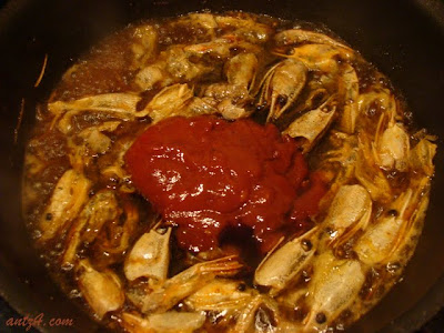 И готовим соус - я не буду особенно повторяться: обжаривают креветки, заливаем вином и виноградным уксусом, добавьте томатную пасту, сахар и мед. Затем сцеживаем